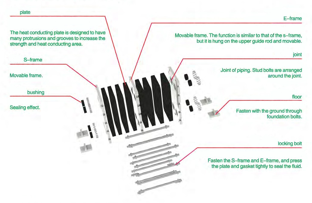 The BKH plate heat exchanger is a type of heat exchange equipment consisting of a set of corrugated meta-plates. These plates have four corner holes, which enable two types of cold and heat media for heat exchange to pass through. It is a detachable plate heat exchanger, made up of plates, bolts, clamping plates, flanges, floor corners, and sealing gaskets.