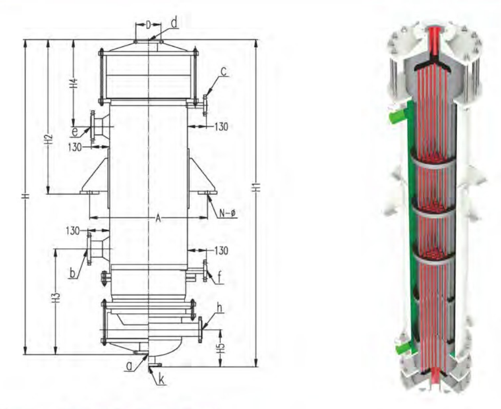 The equipment features a simple and compact structure with low fluid resistance, enabling the manufacturing of large-scale equipment. However, its pressure and temperature resistance are inferior to those of the block hole type. It is suitable for situations without strong impacts and low vibrations, and it is preferably used as a cooling device (condenser).This equipment can be classified into Type I and Type II. Type I does not have a gas-liquid separator, while Type II is equipped with a gas-liquid separator. Type II should be used as a condenser.